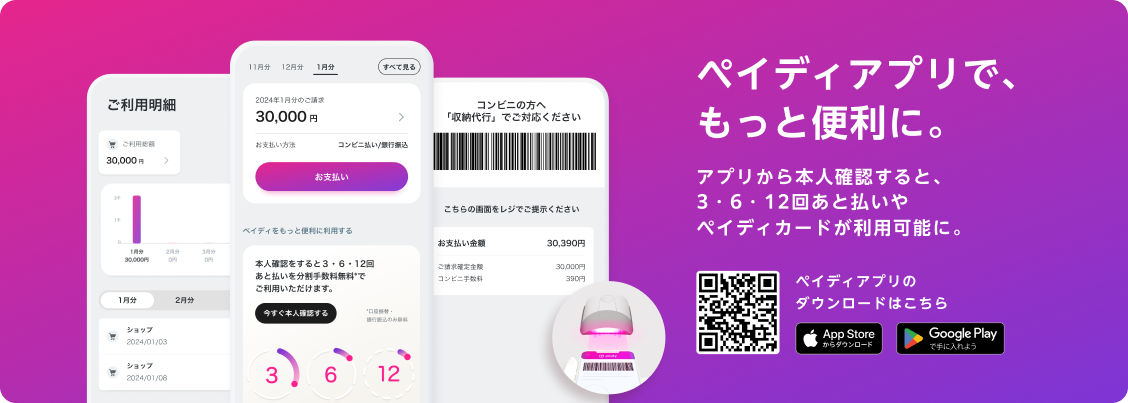 さらに、ペイディアプリから本人確認すると、分割手数料無料(※1)の3・6・12回あと払い(※2)や、使い過ぎを防止する予算設定など、便利な機能をご利用いただけます。